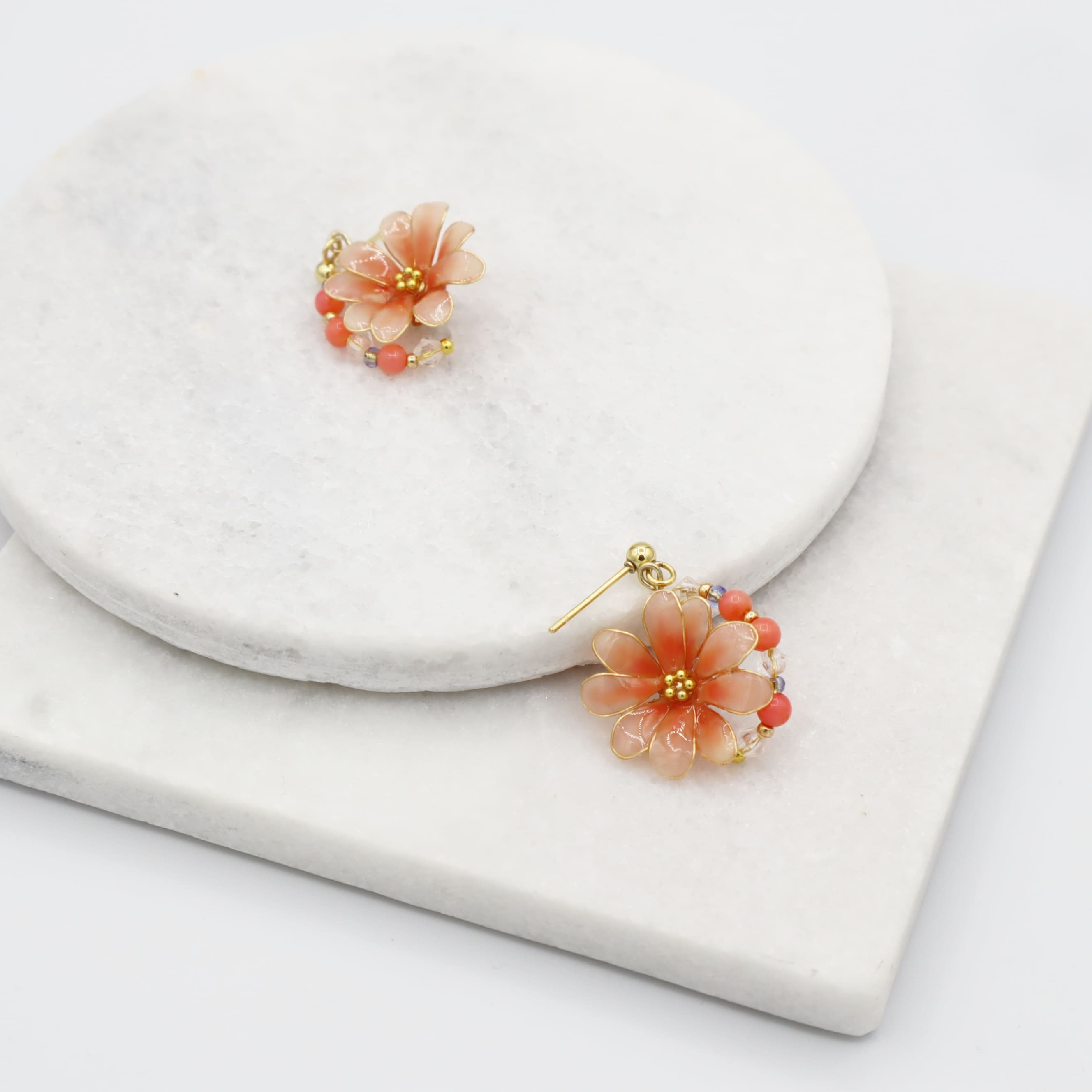 ぜひ、華やかな花とコーラル(珊瑚)の「華さんご(レウィシア)」を耳元に彩ってお出かけください。